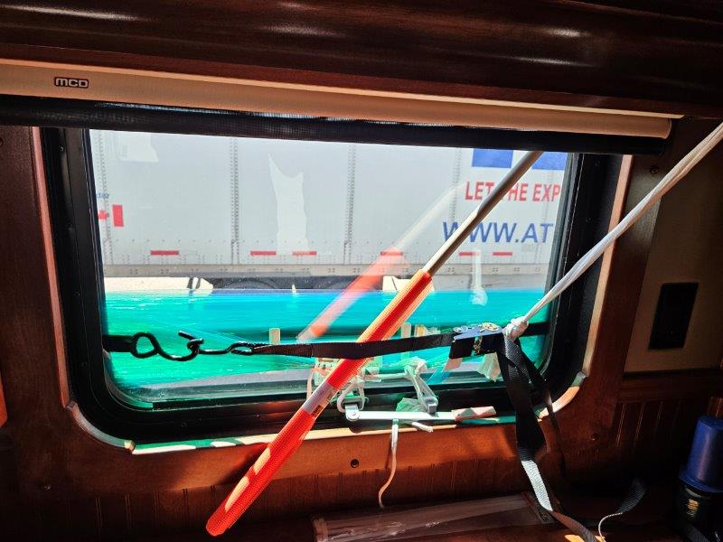 We made an emergency stop at a truck stop and scrounged around their store to find “stuff” to keep the big window closed as we made our way home. This is the result. We used an orange flag because it had a sturdy dowel handle, a ratchet strap, duct tape, an old t-shirt we ripped up, and some stretch wrap. This kept the window closed the rest of the way home. MacGyver has nothing on us! This is now on the top of our to-do list.