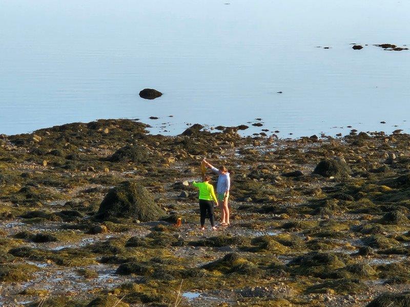 The first morning the girls were with us was low tide at the campground. Upon waking, they promptly headed out to investigate the tidal pools. Here Janelle is tossing around a piece of kelp for some reason. Watch out Laura.