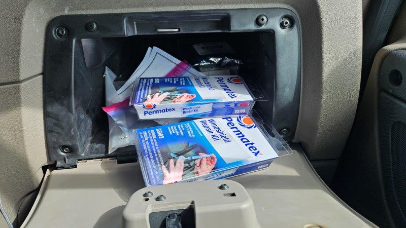 The chip occurred on the passenger side down low. Being the good engineers that we are, we were fully prepared. We had a chip seal kit and some Gorilla tape. This windshield already had two previous chips that we had fixed already. What’s a third? (Said sarcastically.)