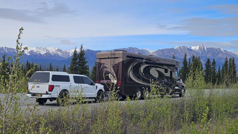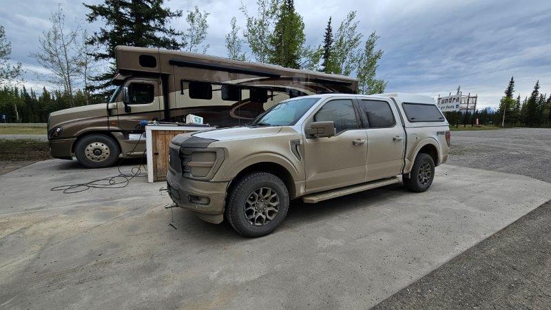 We made the final push to Tok, Alaska, about 90 miles into Alaska. Upon arrival, we were aghast to see how filthy the RV and the truck were after that drive messy, bouncy ride.