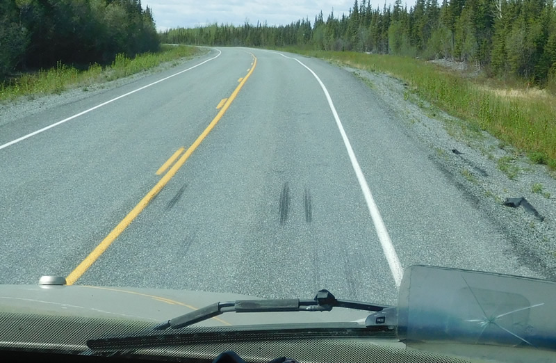When we had stopped at a visitor’s center in the Yukon, the woman there warned us to look for skid marks. That would indicate a dip in the road (probably due to a frost heave). I didn’t think much of it at the time. I just figured that idiots were braking too hard when they came to a dip.