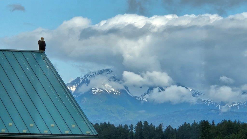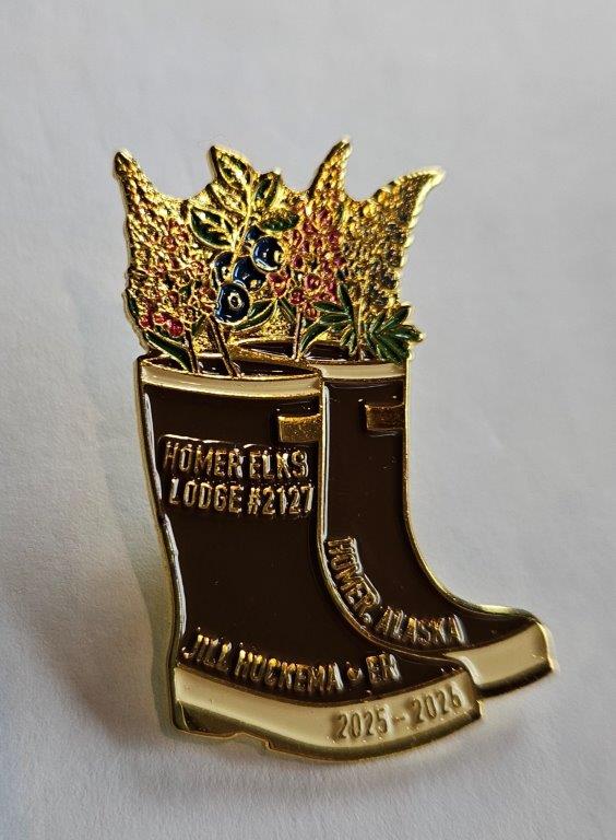 The Homer Spit is a 4.5 mile long strip of land sticking out into Kachemak Bay. The Spit has a number of basic campgrounds, tourist shops, restaurants, and the Homer Boat Harbor. Camping on the Spit is supposed to be a wild experience if you can get a reservation and are into chaos. We didn’t have a reservation and our chaotic days are behind us. Thus, we opted to stay at the Elks Lodge instead. And we are VERY GLAD we did.This is the Homer Elks. They have eight RV spots with 30 amp power and we had the whole place to ourselves most nights.The Elks Lodge is right on Kachemak Bay and has an outdoor balcony that we could access anytime we wanted. Yes, this would do nicely.When we were in the Lodge the first evening, one of the local members said “Look, there’s a bald eagle on the building next door.” Yes! Another eagle sighting. Turns out, it would be the first of many.Elk Lodge leaders (called Exalted Rulers or ERs) typically have lapel pins to hand out during their tenure. I spotted a member wearing this pin and absolutely loved. It featured Xtratuf boots (if these boots aren’t the official state footwear of Alaska, they should be) with lupine, fireweed, and blueberries spilling out of the top of the boots. Apparently the ER heard I was admiring the pin and later that evening she knocked on the RV door and handed us two of them. What a nice surprise.