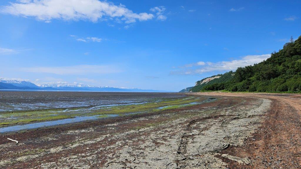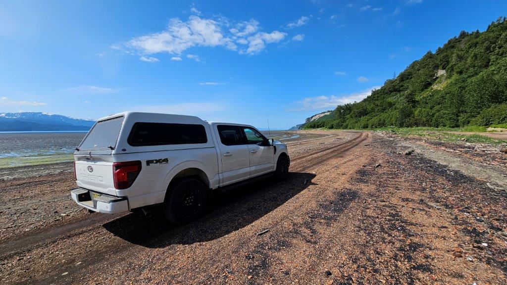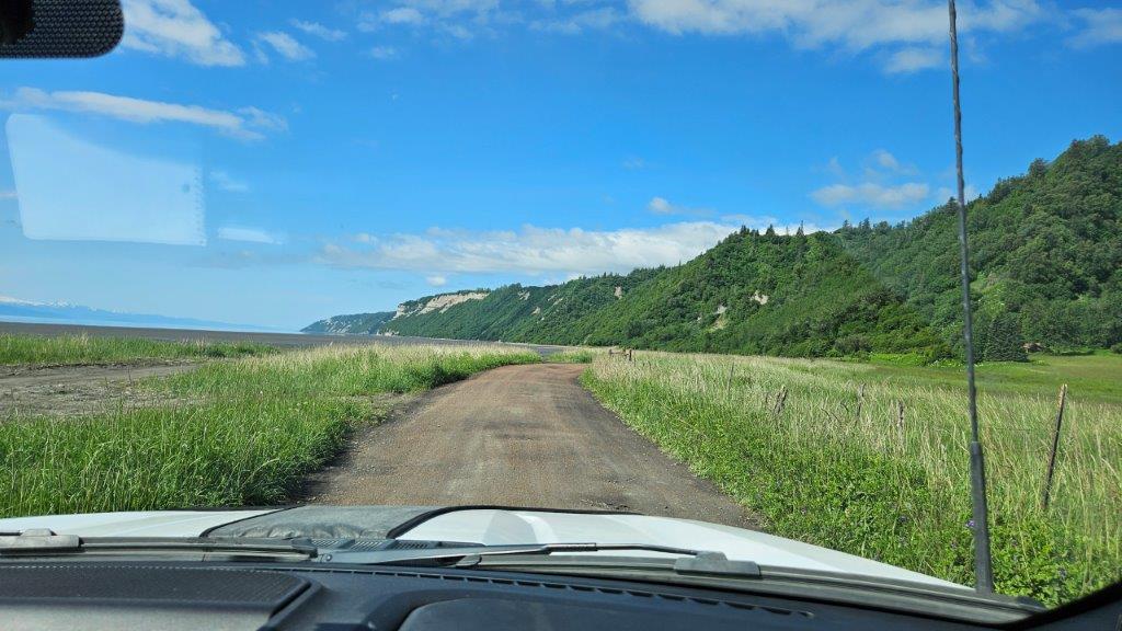 Are we even supposed to be here?And there we were, on the mud flats at low tide. Mind you, our new truck didn’t even have 2000 miles on it yet at this point. “Yikes” is what I said. James was having a 4 wheeling blast.Low tide in Kachemak Bay.OK…I admit it, it was pretty cool to be out here.What comes down must go up, right?I just hoped we didn’t come across another car on this little excursion. Every so often, we would see a driveway and accompanying house. If you need a gallon of milk, you don’t just pop out and get it! We couldn’t believe people lived wayyyyy out here.