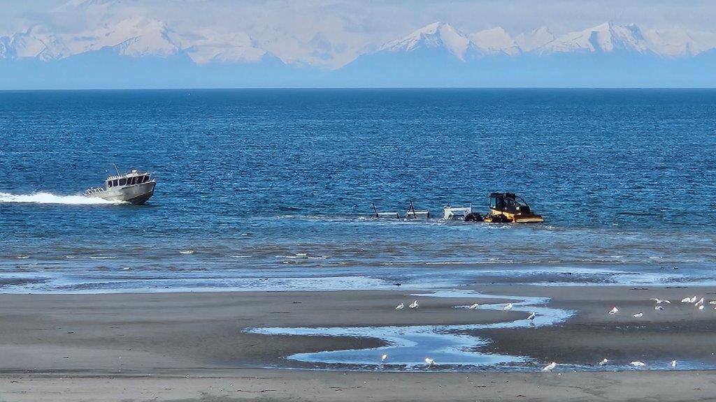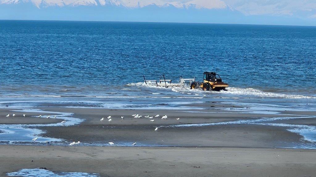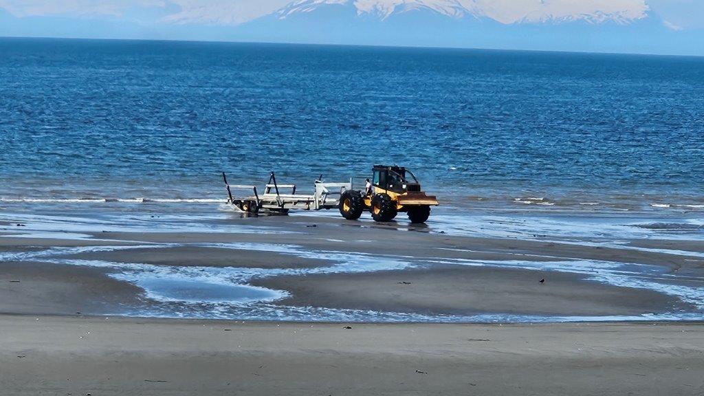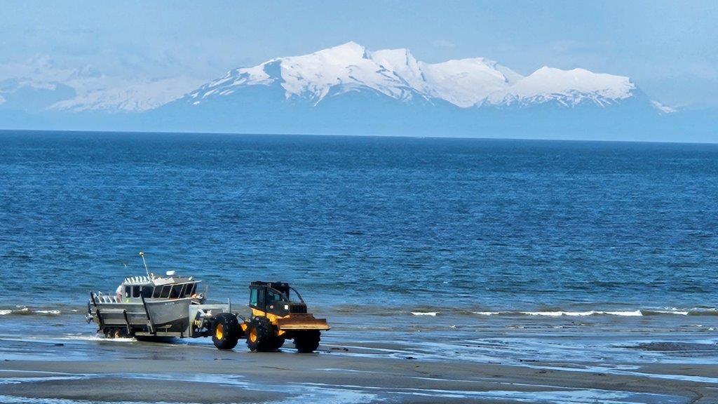 Anchor Point Beach is a popular spot from which to launch your fishing boat. But there isn’t a traditional boat launch, especially considering how big the tides are. But there is a road of sorts down to the beach. One enterprising company will put in/take out your boat for you in a unique manner for $80 (according to the Internet). Let’s get out the heavy machinery!