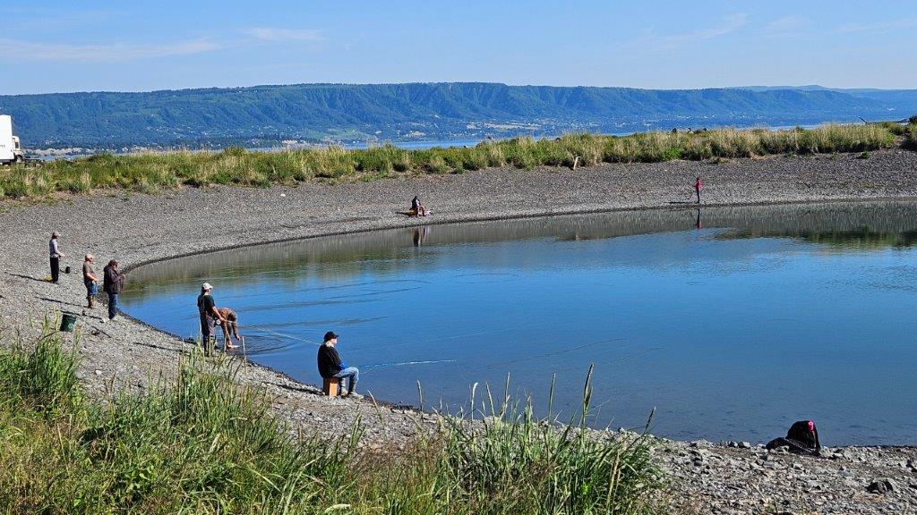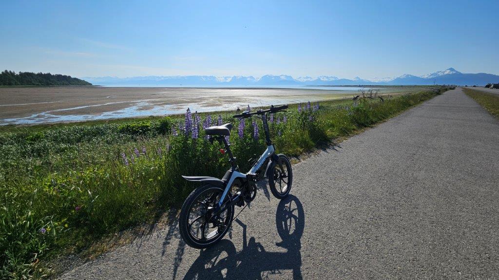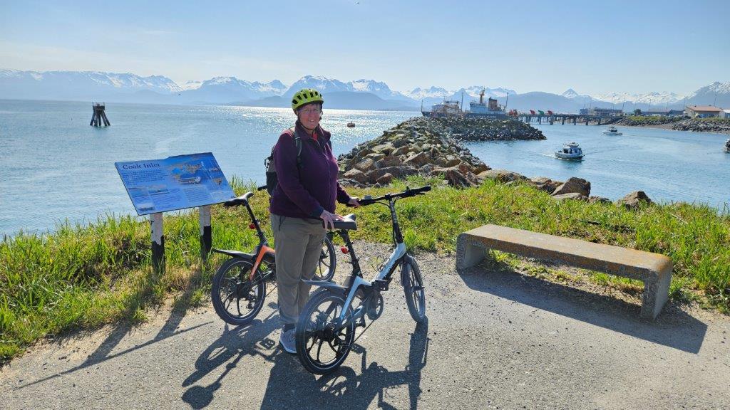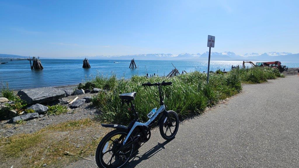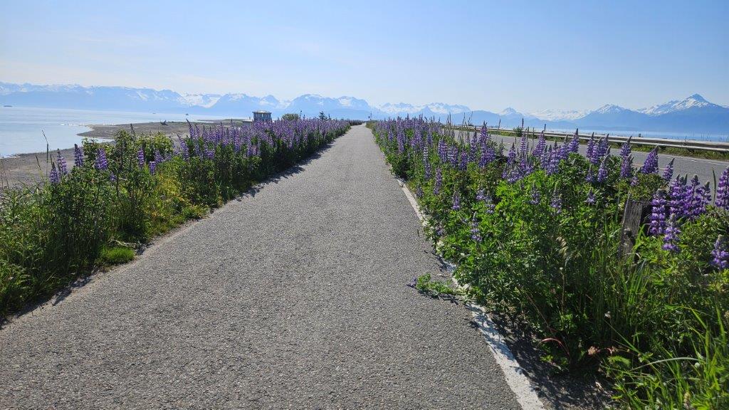 It was time to get the eBikes out again. There was a paved bike path the 4.5 mile length of the Spit. Woohoo! That’s my kind of riding.This mental image will forever be in my mind. Here I was, riding down a lupine lined path with glaciers and mountains in the distance. Life is VERY good.At one point along the Spit pathway, we found this fishing hole that is stocked with salmon. We watched for a bit and found the fisher-people where “tight lining” for fish. We only knew this because a local explained what was happening. The fisher-people looked like they had fly fishing rods. They would cast into the water and immediately pull the line back in. They were hoping for the salmon in the water to bite the line. Jerking the line back quickly would cause the line to slip through the fish’s jaws. Once the end of the line was reached, a hook at the end of the line would snag the fish. Personally, after seeing something like this, I appreciate being at the top of the food chain.We rode all the way to the end of the Spit. My knees enjoy having battery power (on the bike…not in my knees).The harbor, full of fishing boats. Salmon season is just ramping up.Time to head back.As we turned around to return the 4.5 miles, a cold fog rolled in over the Spit. Let’s just say I got the opportunity to try out the highest battery setting (speediest) on my eBike. We definitely got back quicker than we got out to the end of the Spit. We were a tad chilly by the time we got back to the truck. But the ride was still worth it.
