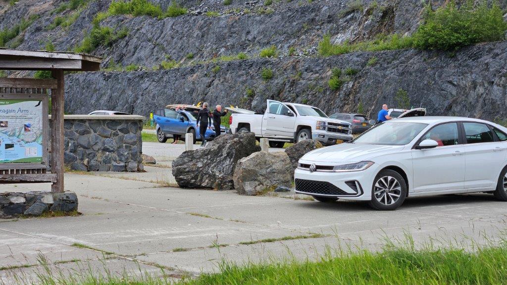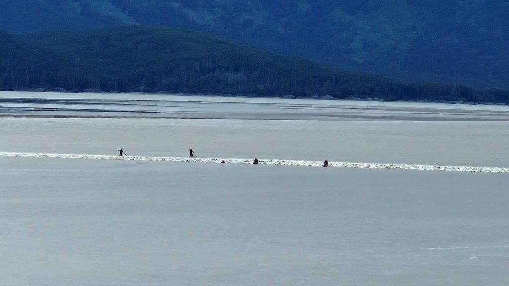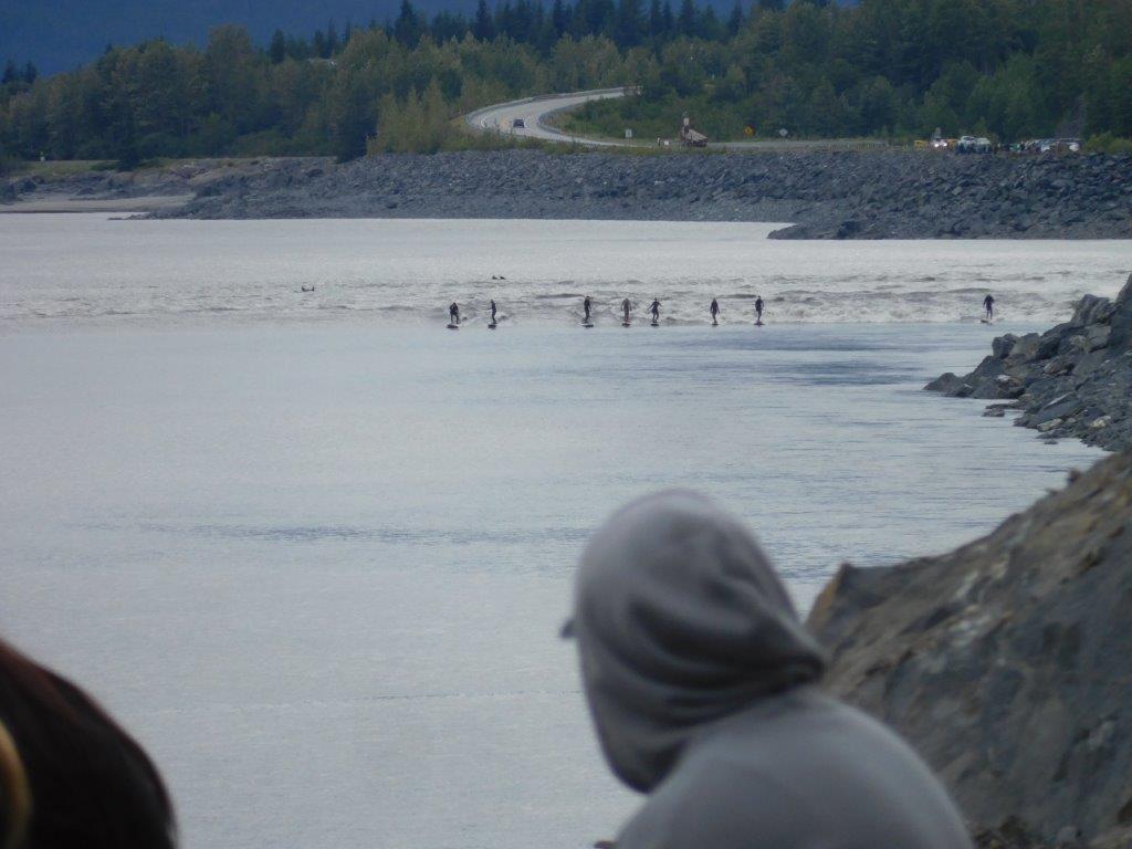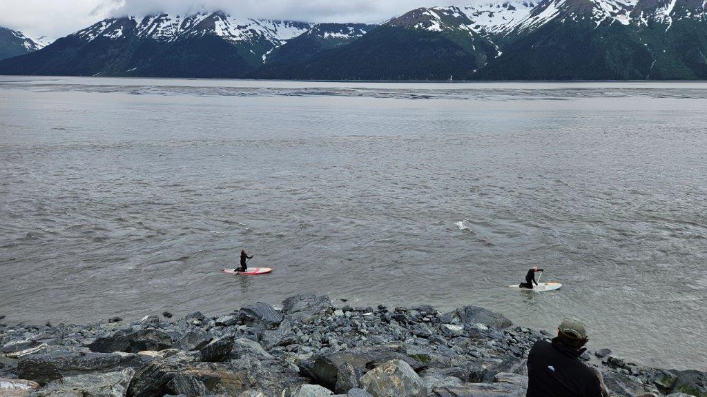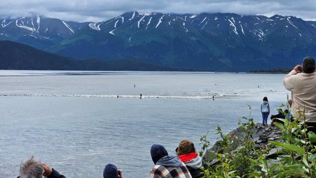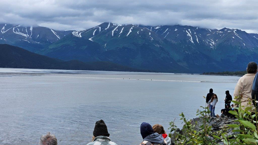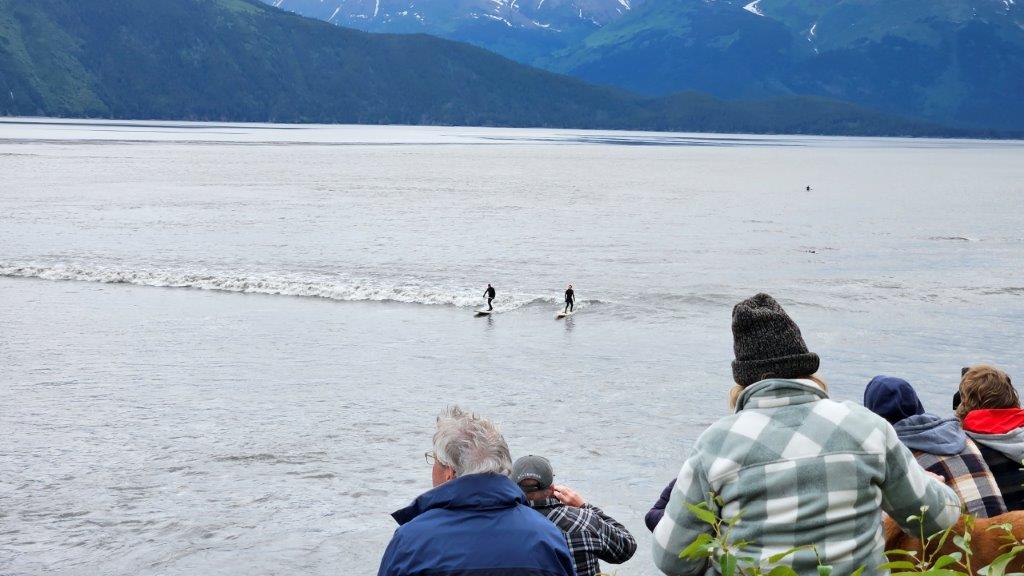So, Turnagain Arm is such a narrow bay. We realized during our visit with Janelle in early June, that we would be in the vicinity of the Arm during a time (late June) when the incoming tide would be larger than normal. There would create a bore tidal wave! And people SURF that wave!!!!! So we could witness not just a bore tide, but the surfers. This we had to see, so we arranged our various excursions to put us at Turnagain Arm at the appropriate time.
