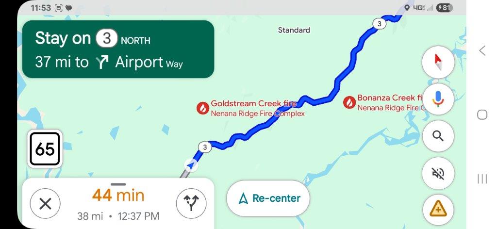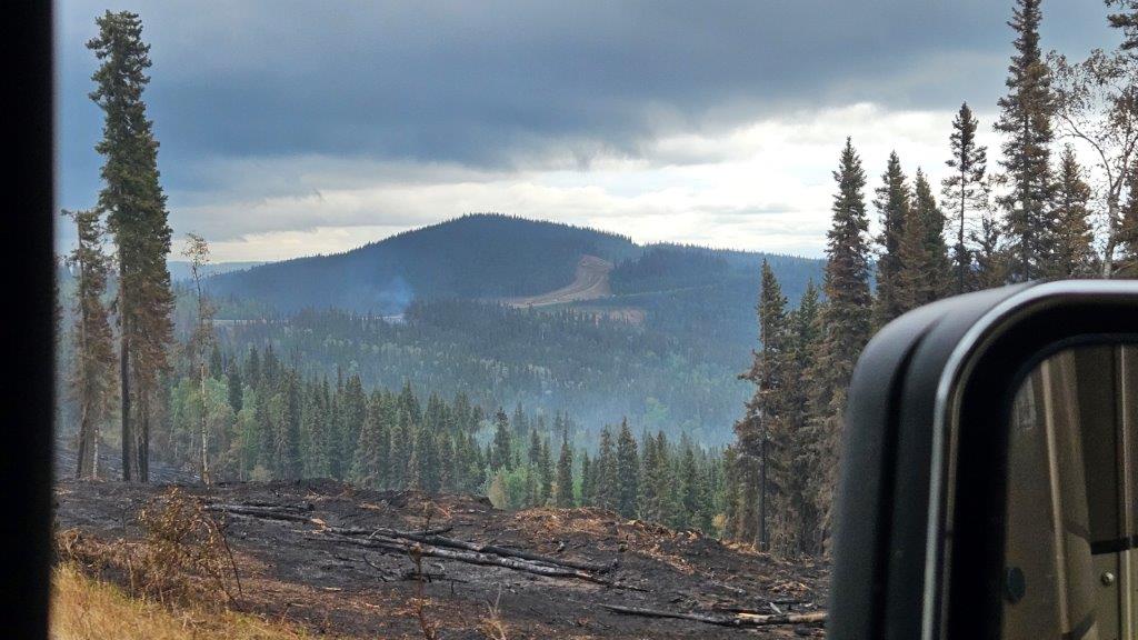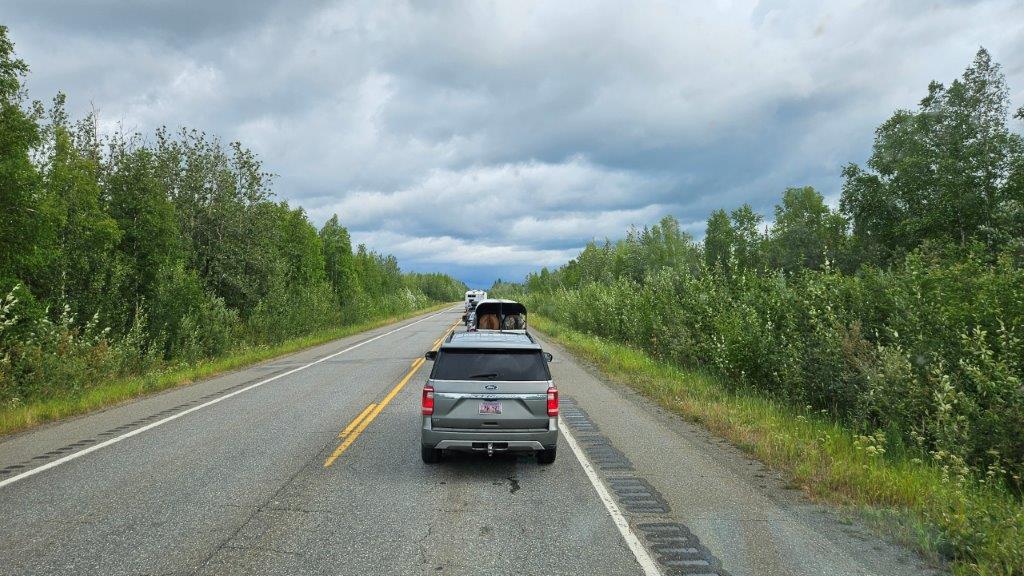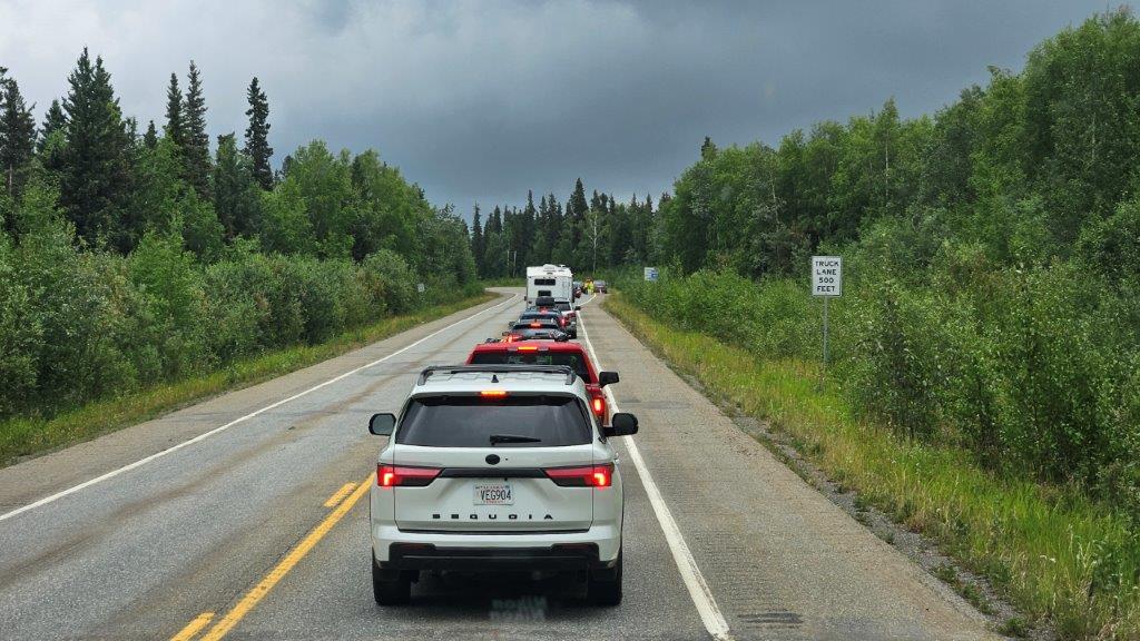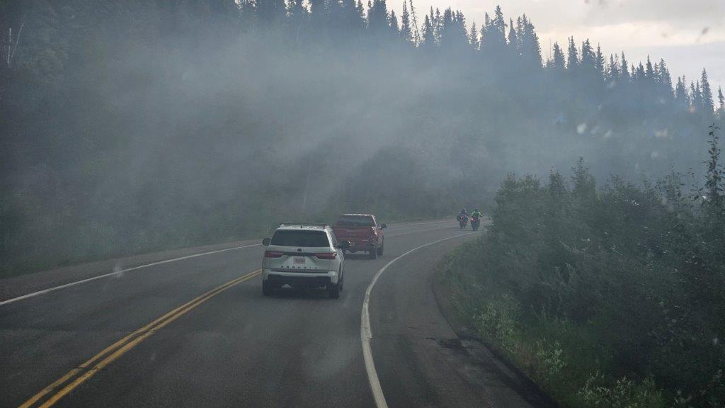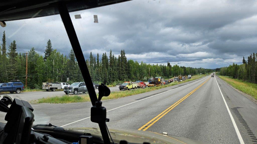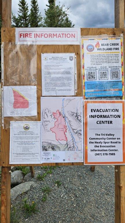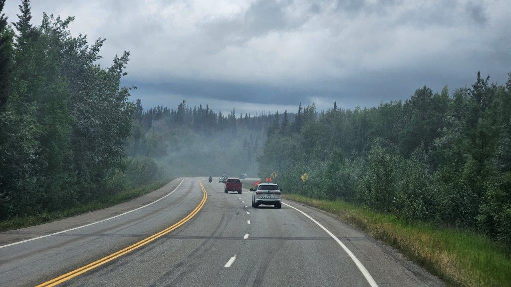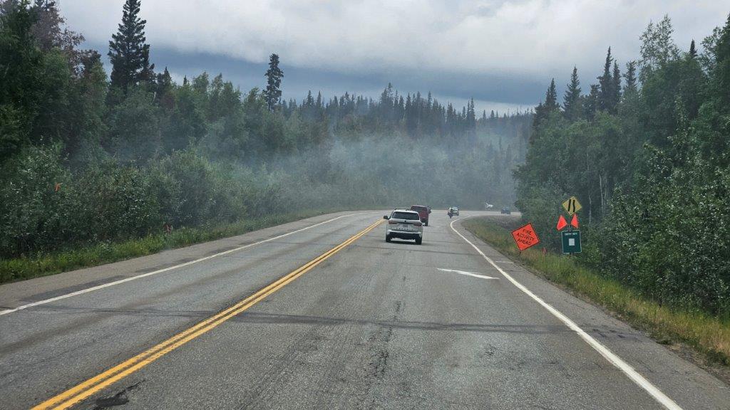By the time we left our boondocking spot, the Bear Creek fire mentioned on the easel was pretty much contained. But we still had fires further up Highway 3 to contend with. The Alaska 511 website was checked frequently. We knew that there would be delays on the highway, there were pilot cars taking vehicles through the region affected by the fires.