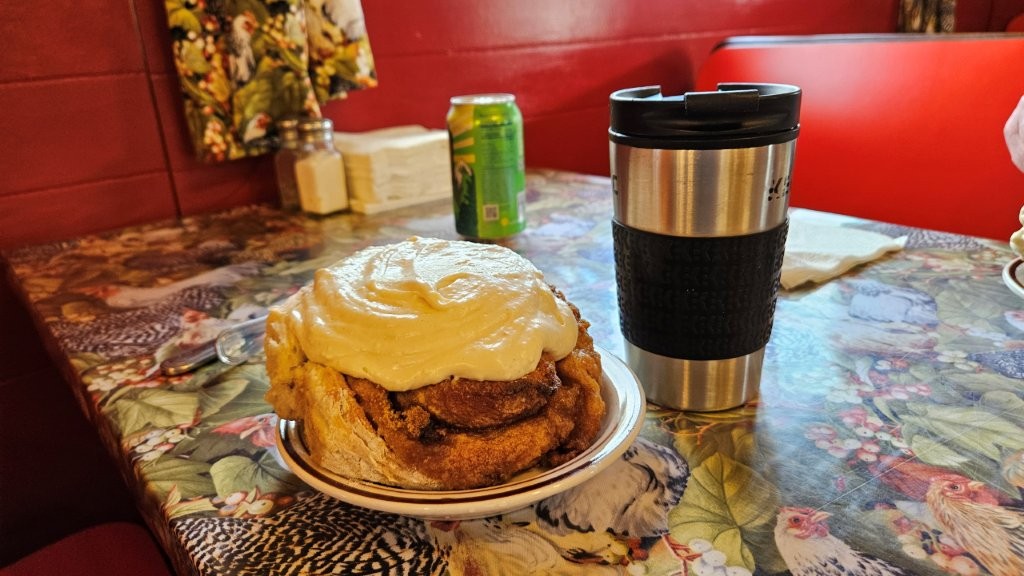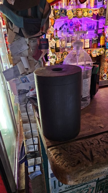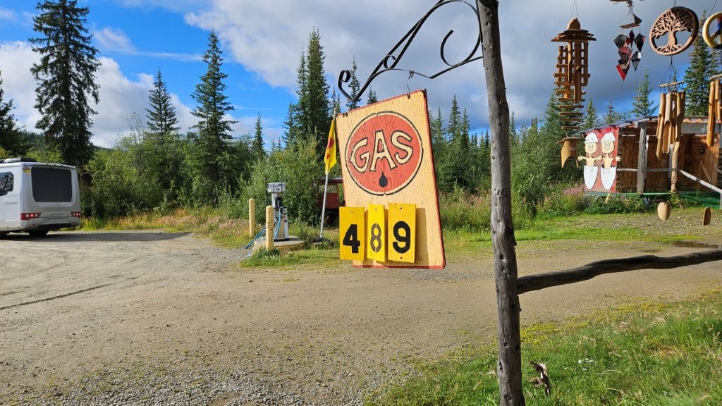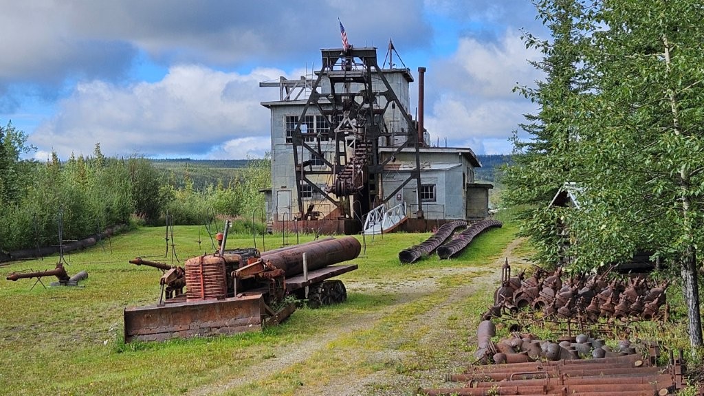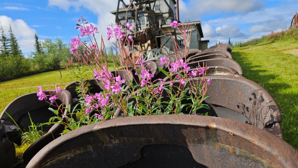 Las Cruces may have its famous roadrunner made of recycled materials (this link will take you to a picture of the roadrunner if you have never seen it). Chicken has a chicken made of old school lockers!This is the Chicken Creek Saloon, one of three businesses in Chicken.Inside the Saloon, tacked to the ceiling, are old hats and…could that be???? Underwear!Yes, it’s underwear. This black device is called the “Panty Cannon”. We did not see it in action, so I have no idea how it works other than it involves some black powder. I’ll let others google it if they wish. Knowing even this much is TMI (Too Much Information) for me!We stopped back the next morning for the Chicken Cafe’s famous (and huge) cinnamon rolls.You can buy gas in Chicken. How often do you see the price of fuel advertised like this? At least it’s cheaper than fuel on the Dalton Highway.Chicken also has an old gold mining dredge in the town. More on dredges in the next blog post.With the dredge buckets now unused, Fireweed was taking up residence.