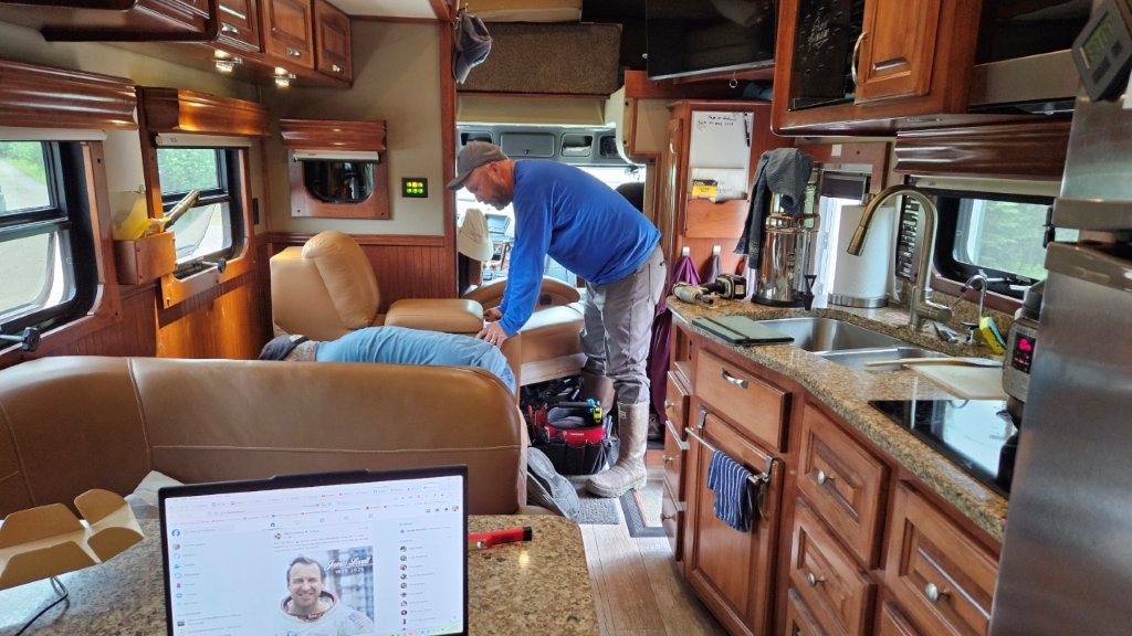 By the time Shaun arrived, we had a pretty good idea what was going on. Our slide out moves via electric motors and lead screws. There is rubber weather stripping that protects the screws…it works great UNTIL the weather stripping rips loose and starts to wrap around the lead screw. This had happened before on the slide out and we were able unwrap the rubber from the lead screw from underneath the slide. It was not so easy this time, we needed to get at the lead screw from the top.