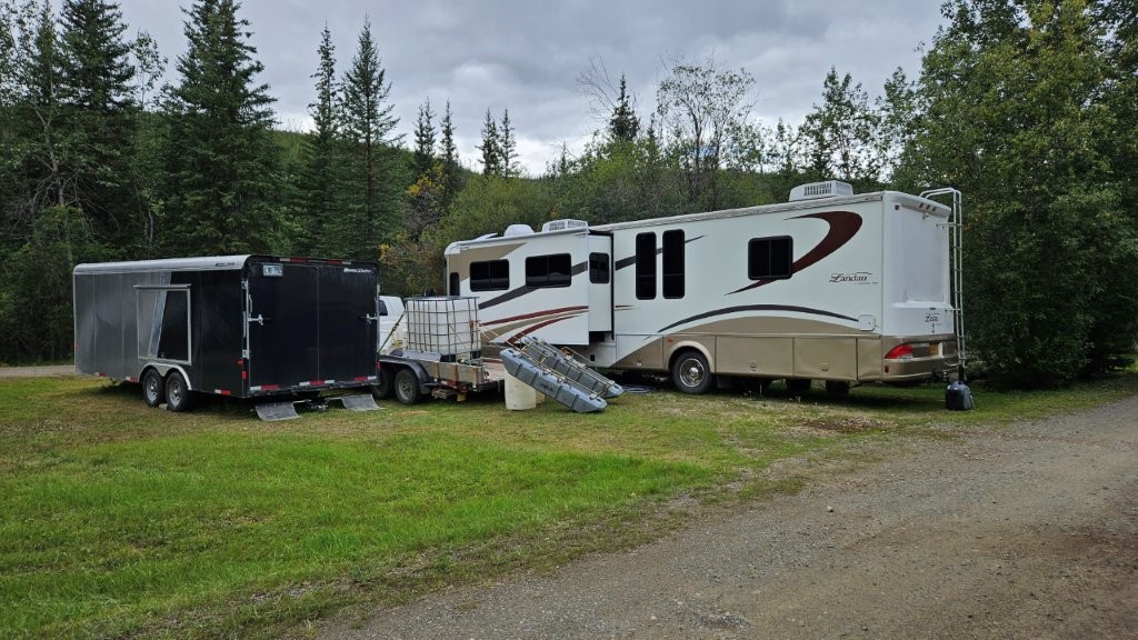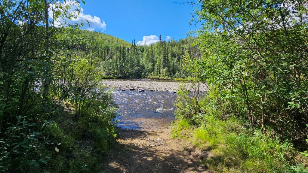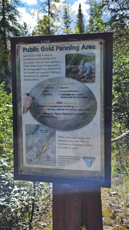 We were told the water was low! Did not look low to us.Blueberries were in season. We munched on a few. But to really gather a significant amount of berries, you would need a blueberry rake.This sign was our first indication that gold mining was about to become a big theme for the next few days.This campsite was our second indication of the existence of gold mining in the region. When we asked why this campsite had so much “stuff,” we were told “Gold Miners!”