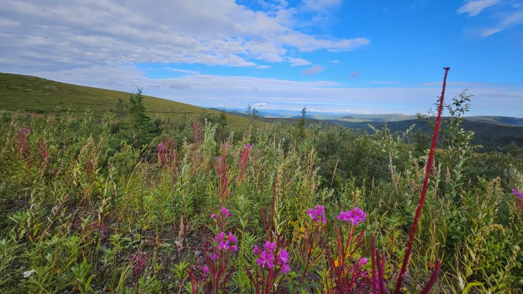 Someone actually paved this section of the highway!This highway was at the top of a ridge line. We had far off vistas the entire way.Fireweed giving us one last show before the petals drop.And just like that, it was “Welcome to Canada” and “Good-bye Alaska.” US and Canadian customs share a facility here in the MIDDLE OF NOWHERE!!!! This border crossing is only open during the day and only in the summer. In the winter, this road is completely closed down.