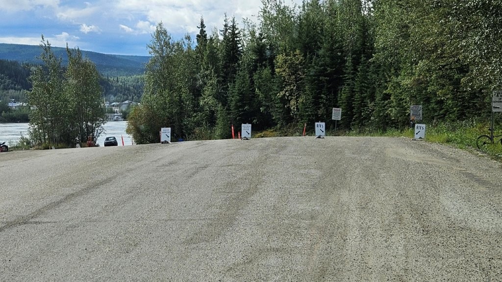 RVs line up on the right.We had the Blue Flame, our previous RV on ferries many times, but this would be Sandy’s first ferry ride. But first we had to wait. We were fortunate to be there early enough in the day that there wasn’t a line. Later in the day, it could take an hour or so to get on the ferry.This is the approach to the ferry, once it arrives. All dirt! I suspect winter ice could really wreak havoc on a permanent concrete ramp.The smallish ferry arrived after making a seven minute crossing. The river flows pretty quickly, so it takes some skill to hit the ramp with the boat.This trip had an RV and maybe three cars on it.Our turn! We wondered how many vehicles they could fit on the ferry with us.How many with us? ZERO! Our RV and our towed truck was all they could/would fit They had James center the RV on the boat. With our gross vehicle weight of 55,000 pounds (RV and truck combined), it was probably a smart thing to do.We pulled forward some more and they put up a chain to keep us from driving off. As if that little chain could stop our RV! Unfortunately, they don’t let you out of your vehicle during the crossing. I wish I had a picture of our rig on this ferry boat.Seven minutes later, we were approaching the ramp (again dirt) on the other side. These ferry operators really know what they are doing.