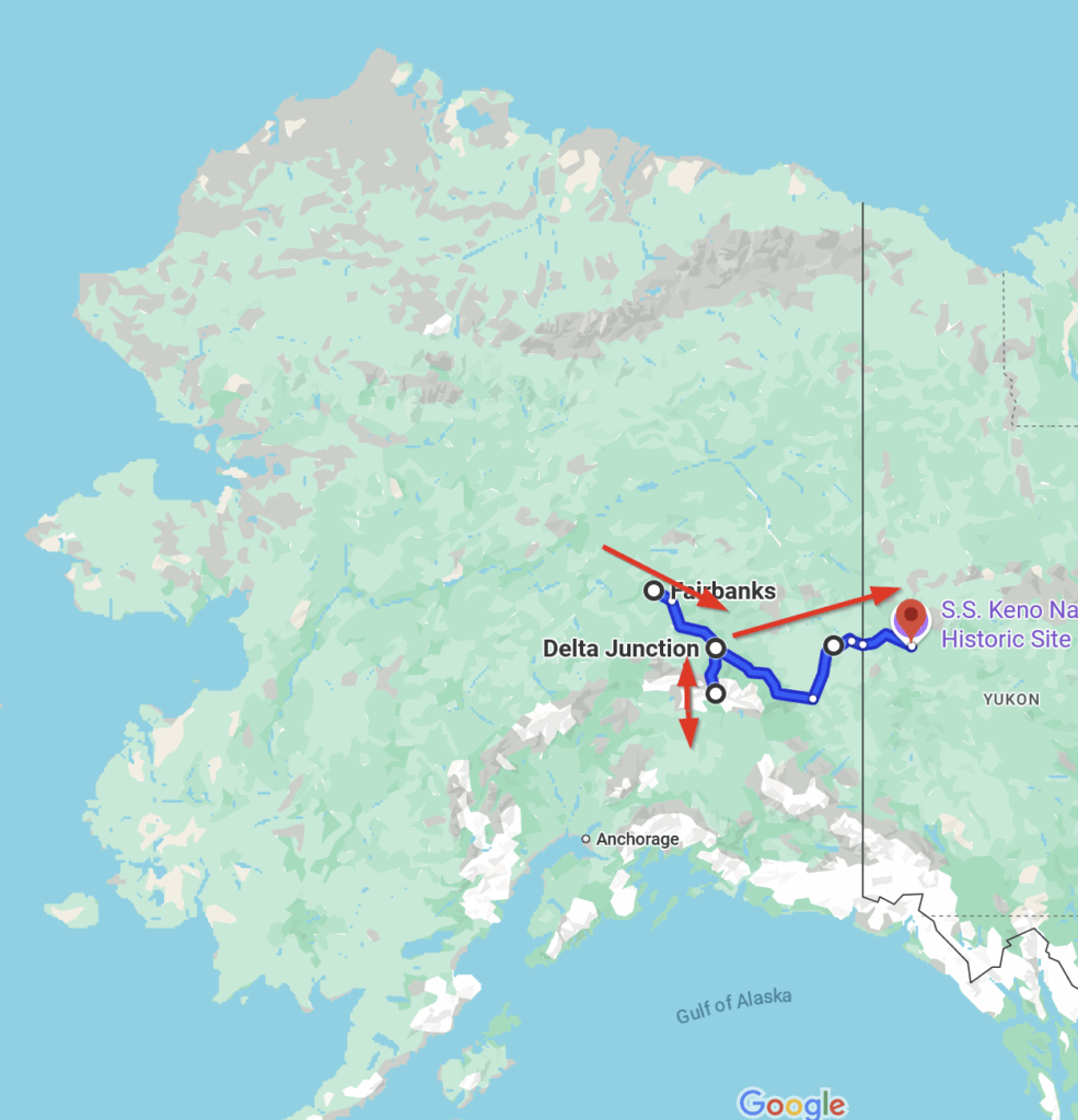 We left Fairbanks for Delta Junction. From there, we took a side trip south to see the Denali Fault Line. Then we headed to the Top of the World Highway and the quirky town of Chicken, eventually ending up in Dawson City, Yukon.