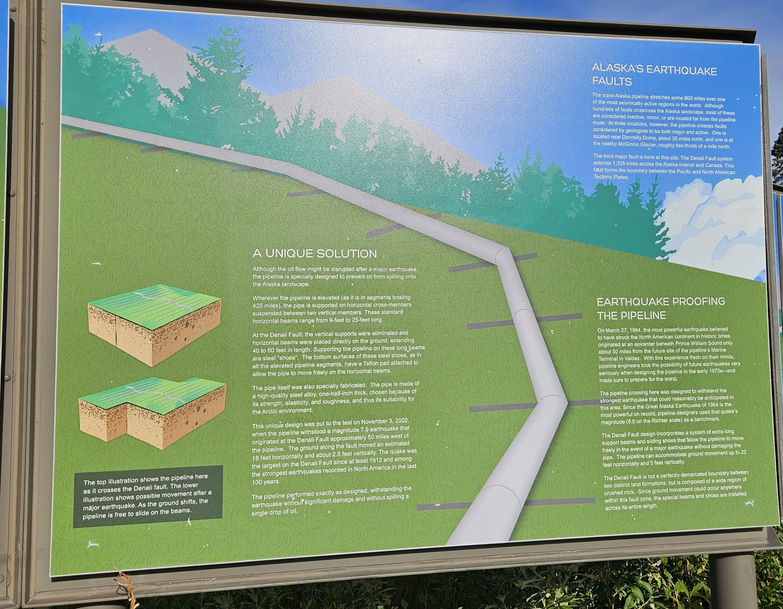 Once again, we found ourselves approaching the Alaska Range. It was still just as beautiful.This is where the pipeline crosses the Denali Fault. The pipeline sits on these horizontal beams. So when the earth shifted, the pipeline slid sideways along the beams. Looking at the beams from the side.This is the full explanation. I’m not going to try to regurgitate all this for you. If you click on the picture, it should enlarge so you can read it. Just be assured, the pipeline survived a 7.9 earthquake by NOT being constrained.